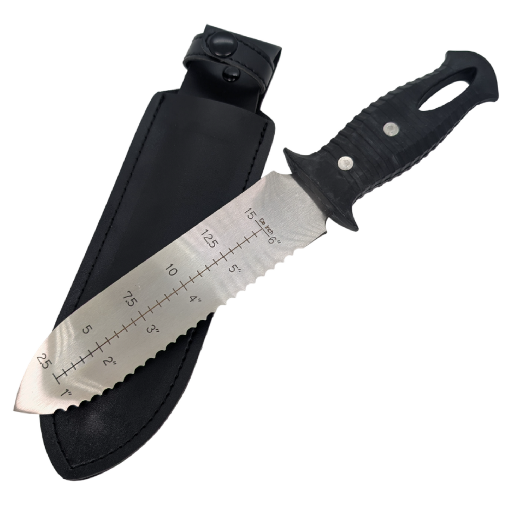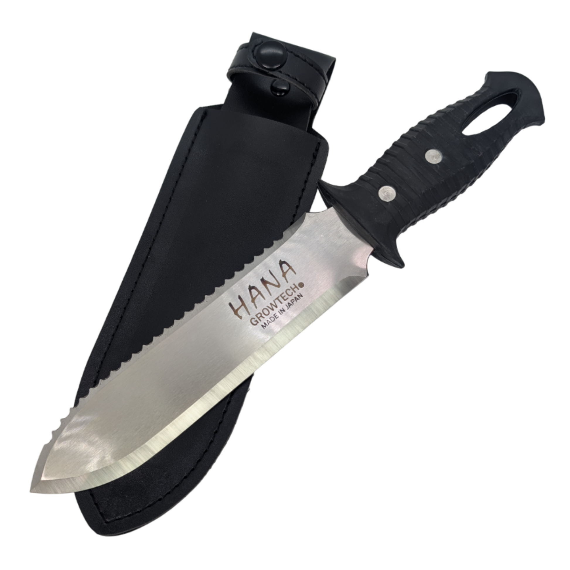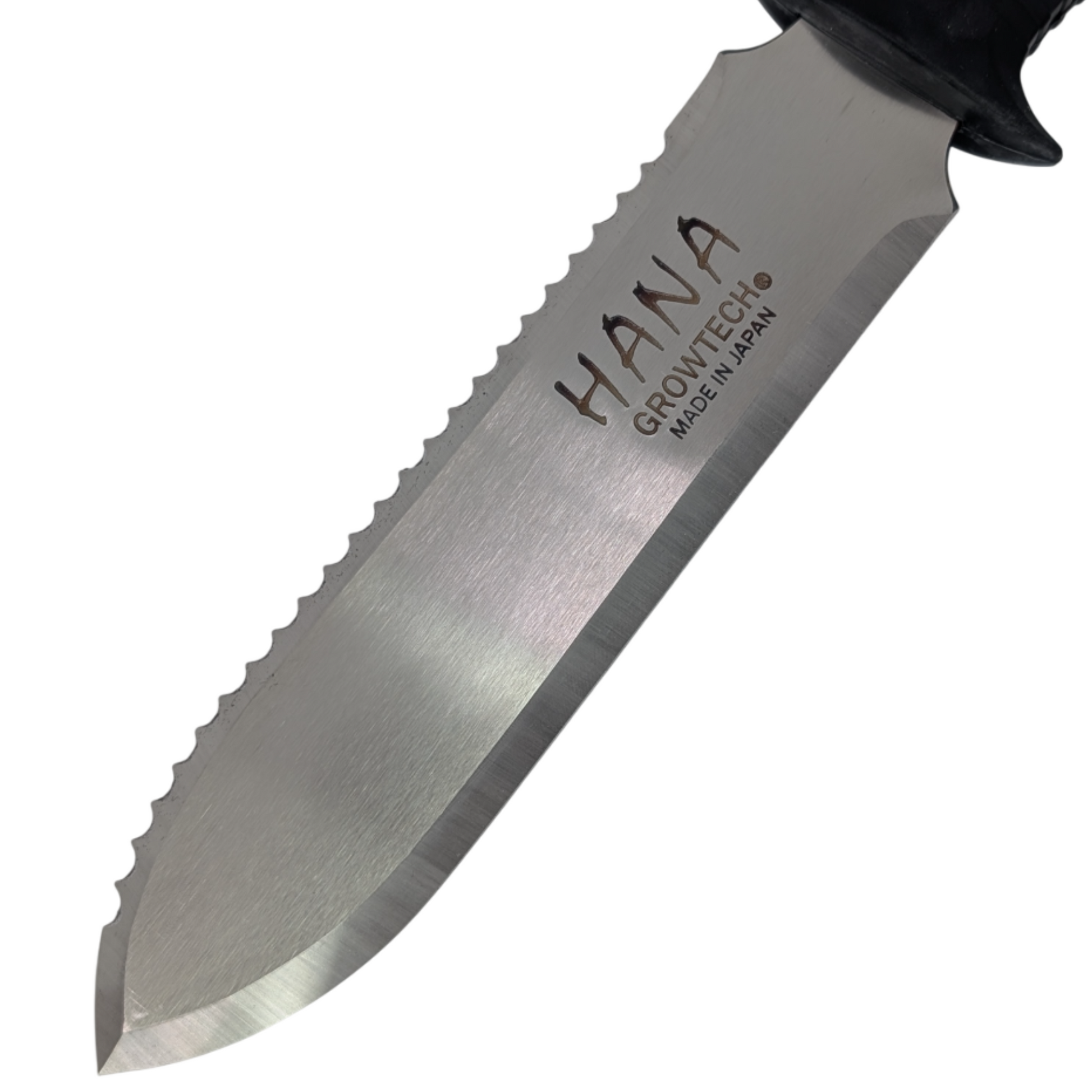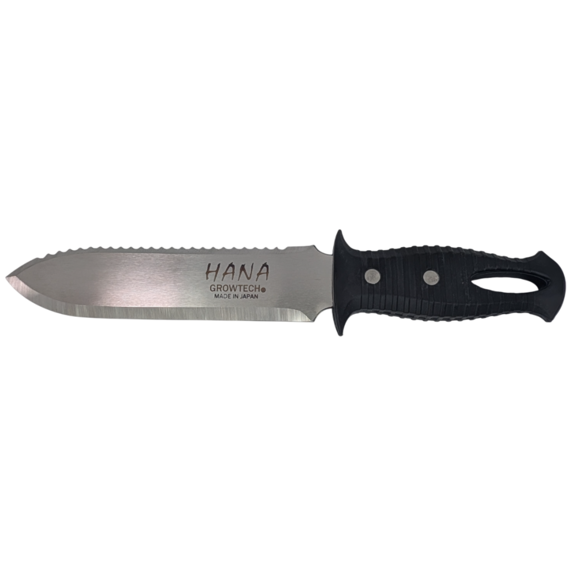 The Growtech HANA Hori-Hori with Rubberized Grip is a versatile, high-quality gardening tool favored by Master Gardeners, suitable for weeding, planting, dividing perennials, and cutting sod. Its 7-inch stainless steel blade is beveled for shoveling, serrated for sawing, and marked for depth measurement, ensuring precise planting. The rubberized handle provides a secure, comfortable grip, while the reinforced vinyl sheath offers safe storage. Weighing 11 oz. with an overall length of 12 inches, this tool combines durability, comfort, and functionality, made in Japan.