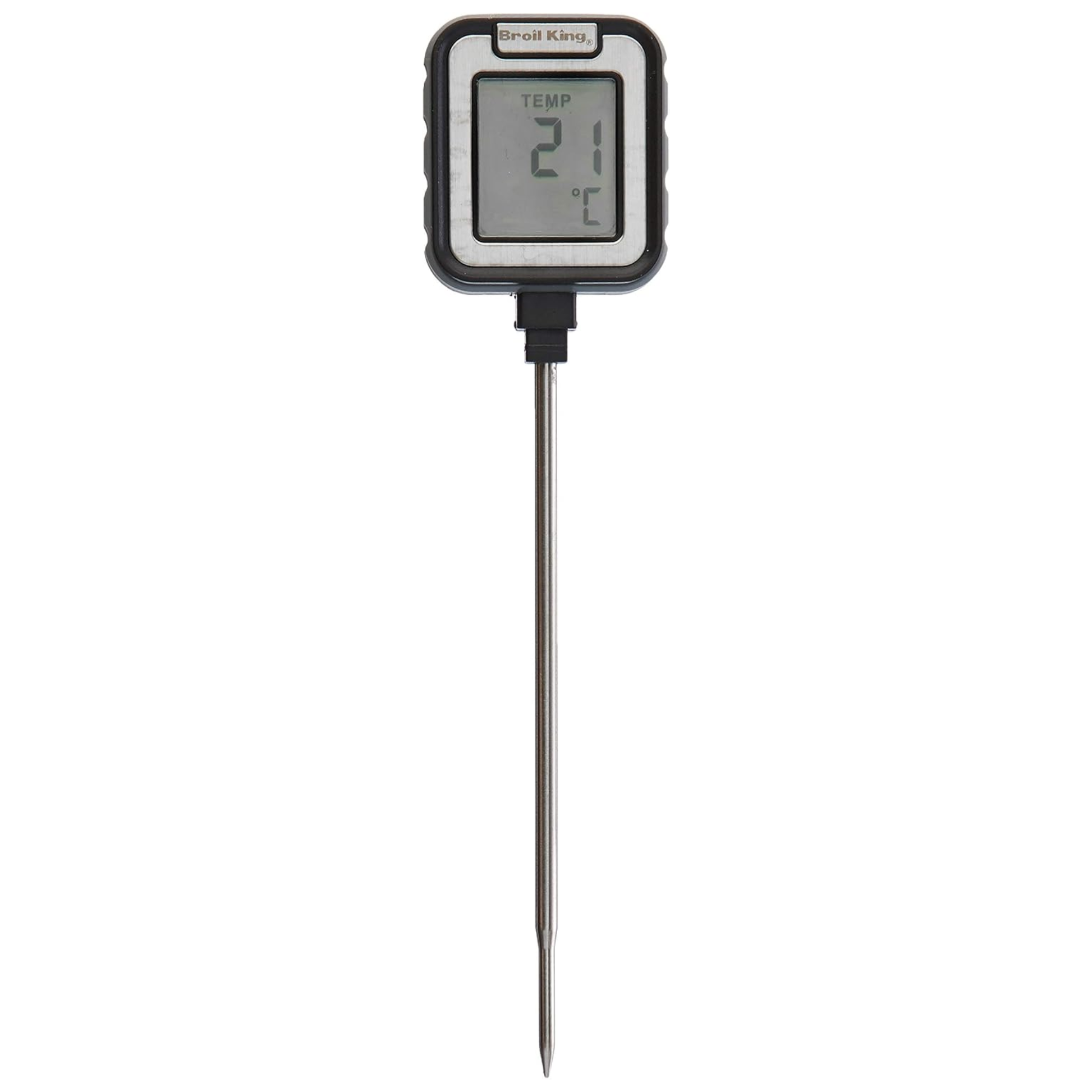 The Broil King Digital Probe Meat Thermometer is a reliable tool for quick, accurate temperature readings, featuring a backlit screen, a fine tip probe, and a rugged body built for durability. It comes with a resin sheath and a battery for convenient use, ensuring consistent performance. Designed for ease of use, it offers a 1-year limited warranty, making it a dependable choice for monitoring meat temperatures without Bluetooth connectivity.