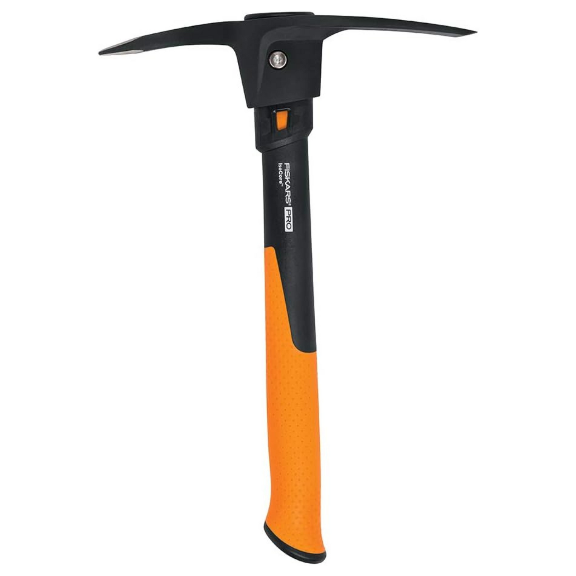 The Fiskars Pro IsoCore 1.5 lb. Pick is a rugged tool designed for heavy-duty use, featuring a patented IsoCore Shock Control System that reduces muscle fatigue and joint pain by absorbing shock and vibration. It offers a durable, balanced design with a versatile head that can be used as a pick, mattock, and hoe, making it ideal for tackling tough surfaces in landscaping and excavation projects.